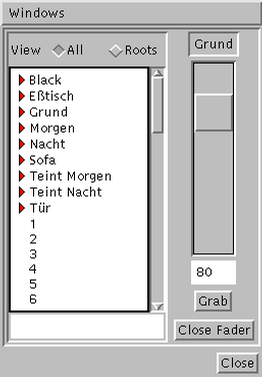 Auf der linken Seite des manuellen Faders erscheint eine Cue-Liste wie im Skript-Fenster und in Cue-Fenstern auch. Durch Doppelklick auf einen Cue-Namen oder eine Kanalnummer wird der manuelle Fader durch einen Regler erweitert, der genau diesen Kanal bzw. Cue kontrolliert. Ein solcher Regler ist normalerweise inaktiv, hat also keine Auswirkungen auf die Beleuchtung. Er läßt sich durch Drücken des Knopfes Grab aktivieren.