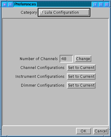 Es wäre natürlich ungünstig, wenn Lula die Kanal-Konfigurationen beim Verlassen ,,vergessen'' würde, und beim nächsten Neustart alles wieder von vorn eingerichtet werden muß. Zwar speichert Lula die Konfiguration beim Abspeichern von Aufführungen mit ab, aber es wäre schön, wenn sich Lula merken könnte, daß die Kanäle 1-48 immer auf die DMX-Kanäle 1-48 gelegt werden sollen.