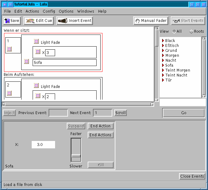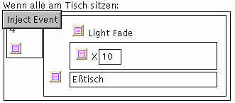 Es ist wichtig, die Reihenfolge der Events während des Abfahrens beeinflussen zu können. Ein Klick auf ein Event produziert ein Menü, dessen einziger Eintrag das Event in die untere Fensterhälfte injiziert; beim nächsten Lichtwechsel geht es dann mit dem Event weiter.